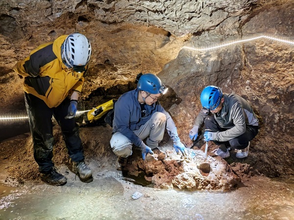 科考队员谭亮成等在洞穴考察洪水事件并进行样品采集