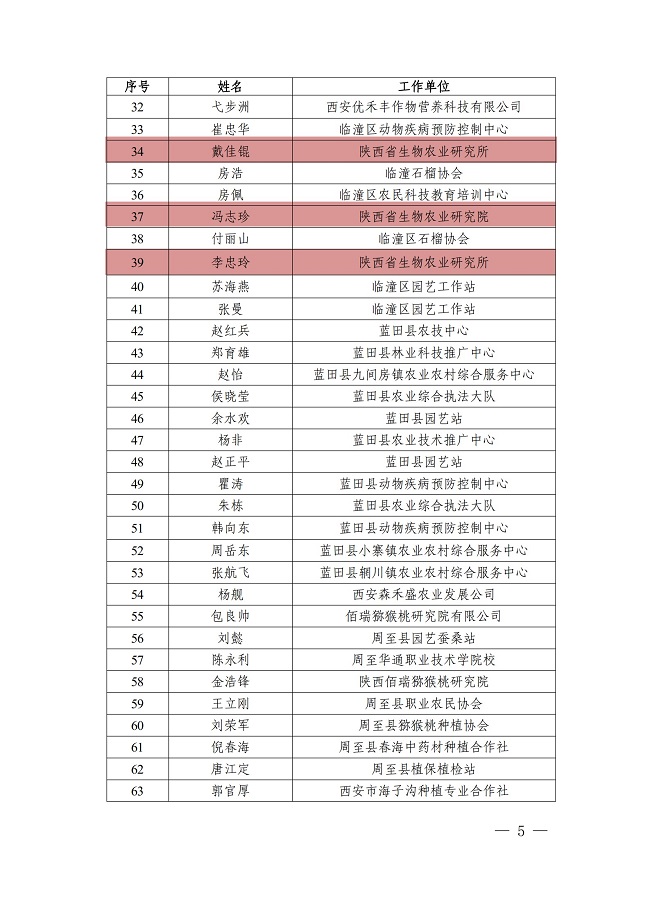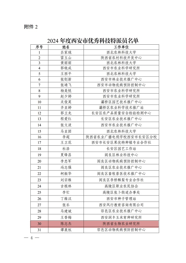 根据《西安市农业科技特派员工作管理办法》,按照注重实绩、简便有效、综合评价的原则,12月8日,西安市科技局公布2024年科技特派员考核结果,考核确定5个优秀组织管理单位、70名优秀科技特派员,予以通报表扬。其中,陕西省生物农业研究所陈志杰研究员、戴佳锟副研究员、李忠玲副研究员、冯志珍博士被考核评定为“优秀”。