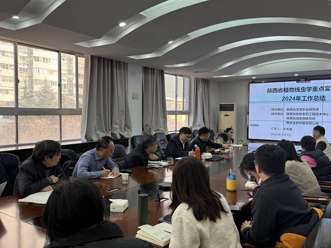 1月5日, 陕西省植物线虫学重点实验室组织召开2024年度工作总结会。重点实验室主任、植物线虫专业委员会主任、中国农业科学院植物保护研究所研究员彭德良,实验室副主任冯俊涛教授,实验室共建单位西安金鹏种苗有限公司总经理李晓东,实验室学术委员会副主任陈志杰研究员,陕西省生物农业研究所副所长张锋研究员,实验室常务副主任李英梅研究员等以及开放课题项目负责人、技术团队带头人及骨干20余人参加会议。会议由李英梅主持。