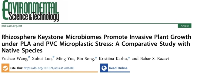近日,陕西省西安植物园(陕西省植物研究所)植被恢复生态学团队王宇超研究员等人在国际顶级环境期刊《Environmental Science & Technology》(IF=11.3,中科院1区Top)在线发表题为“Rhizosphere keystone microbiomes promote invasive plant growth under PLA and PVC microplastic stress: a comparative study with native species”的研究论文。