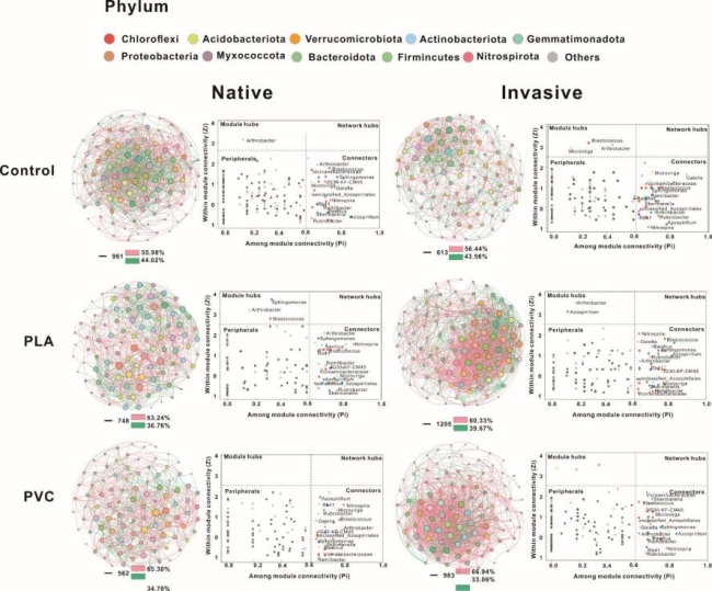 微生物共现网络可视化对比图。在微塑料胁迫下,入侵植物(右)的微生物网络变得比对照组更复杂,而本地植物(左)的网络则显著退化。