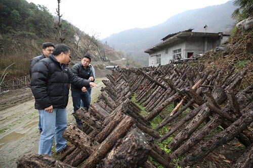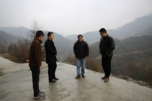 在镇党委、政府举行座谈会后,李保国和扶贫工作队员等与镇人大主席邱洪靖,村支部书记岳建武一起翻过两座山越过两条沟,来到位于半山腰的沔浴河村村口。他们下车冒雨走上2018年资助修筑的一段村级水泥公路上,检查经过冬季严寒冰雪后的质量情况。李保国要求开春后对个别路面不平滑的地方和破损之处进行维修和管护,并汲取经验对今年开建的另一条村级水泥公路要严控地基厚度、排水渠修建标准及过程质量关,以及希望及时掌握省道公路的修筑进度,做好联接相通的前期协调等事项,确实将关系沔浴河村脱贫致富的最关键事情办实办好。在进村途中,他们还到木耳种植户的菌棒架前仔细查看木耳的生长情况,了解存在的问题。
