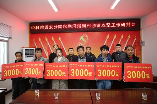 位于山顶云雾缭绕中,在修缮一新的沔浴河村村委会村民技术培训与文化活动室,首先进行了“中科院西安分院包联沔浴河村脱贫攻坚研判会”,李保国、孟繁东、李勃和扶贫工作队员、镇人大主席邱洪靖,村支部书记岳建武与近20位村民代表、贫困户代表、将开展林下红杆天麻种植示范户、生态鸡养殖示范户及村干部等围绕项目实施、技术培训及效益情况等进行交流、沟通,及询问征求对分省院扶贫工作中还需要再改进、提高地方……。而村支书岳建武特别就2019年解决村里生活垃圾倾倒、收集问题以美化村容村貌与大家进行了群策群议,商议探索乡村振兴和脱贫攻坚的契合点。同时,村支书借分省院筹集经费向村里姚腾腾、徐航、陈静等9名大学生家长或代表每人颁发3000元学费补助(通过银行已向每个学生的银行卡转汇)之机,介绍说明分省院3年多开展的包扶工作概况,启发动员今年135户将提前脱贫的农户继续找到适合的扶贫产业和剩余的贫困户积极对接参与到新的扶贫产业项目中,激发起他们的脱贫内生动力,确保如期全面打赢脱贫攻坚战。