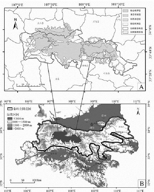 大熊猫国家公园秦岭片区示意图(A)与秦岭国家公园范围示意图(B)