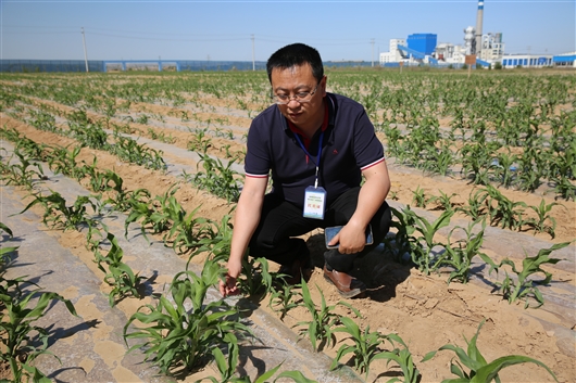项目首席科学家万一研究员观察可降解地膜覆盖的“中地88”玉米品种抗旱性表现