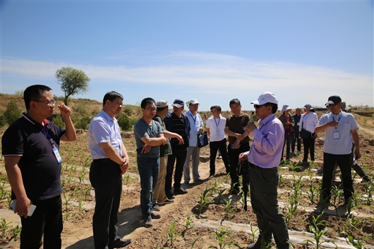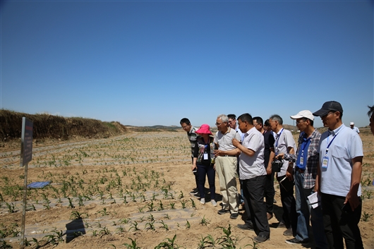 6月2日上午,在湛蓝天空的烈日下,参会人员和专家先奔赴位于佳县刘国具乡王元村的佳县高盛养殖专业合作社试验地的羊草品种比较试验区,观摩在少雨干旱条件下,各个玉米、羊草品种和新选育品系的出苗率及生长势和使用PPC降解渗水地膜模式试验表现效果。随后,又到佳县工业园东方红示范基地高粱示范点观摩、考察PPC降解渗水地膜模式试验和机播示范效果情况;最后,与会专家一行赴布置在佳县北56公里处的方塌镇谢家沟村示范基地察看、观摩玉米、高粱各个品系、品种使用PPC降解渗水地膜模式试验和机播示范效果情况。