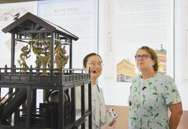 6月11日,在维也纳联合国国际会议中心,联合国外层空间事务办公室主任迪皮波(右)参观中国古代计时装置水运仪象台。本报记者 冯雪珺摄