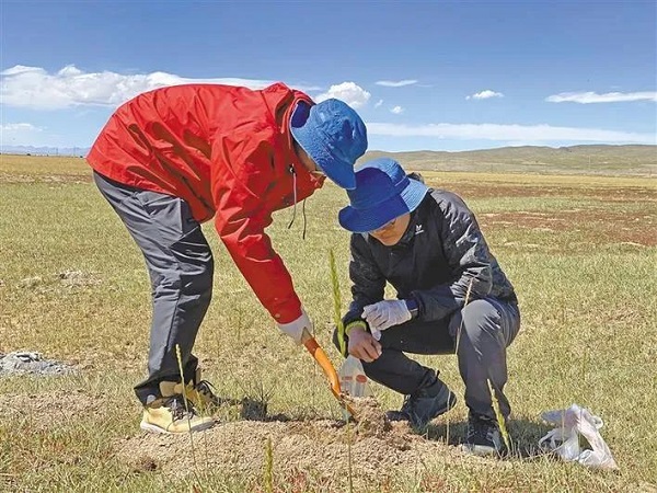 一大早,科考队员们就来到青海省果洛藏族自治州玛多县城外的一片草场收集样本。前一天晚上,他们在这片草场仔细布置过采样工具。