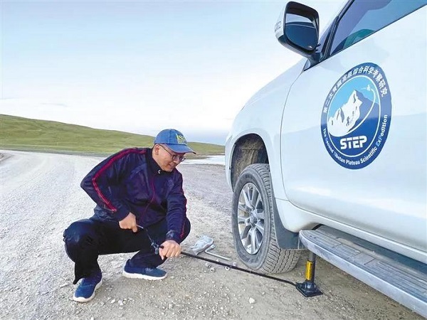 8月26日,记者见证了其中的“冰山一角”。8月26日中午,收集了玛多县城外一片草场的样本之后,科考队继续驱车前往黄河源保护区核心区域。行驶了十几公里后,一辆科考车爆胎。值得一提的是,科考队没有专职司机,整个科考全程,队员们轮流开车。只见大家娴熟地把车推到路边,开始齐心协力换轮胎。海拔4200多米的高原上,稍微用力就感到体力不支。不到一个小时,轮胎换好了,几个队员开车返回,到县城寻找修理厂,其余车辆继续前行。