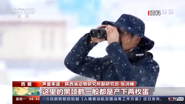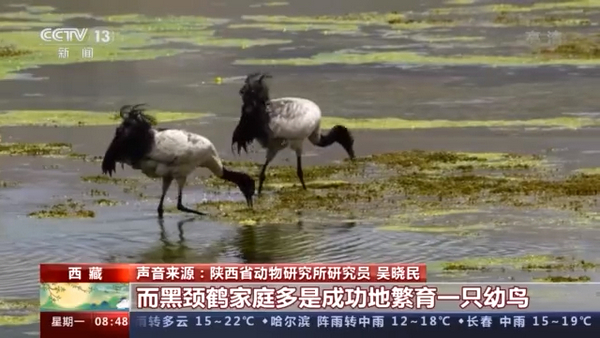 陕西省动物研究所副研究员 张洪峰:据当地群众反映,这里的黑颈鹤一般都是产下两枚蛋,雏鸟能够成活两只的很少,我们对于它的这种现象还得进一步观察。