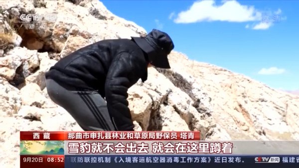 那曲市申扎县林业和草原局野保员 塔青:雪豹是这样过来的,岩羊在这个地方的话,雪豹就会在这里蹲着。