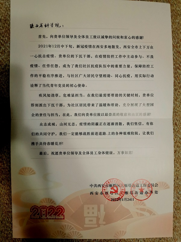 2021年12月中下旬,新冠疫情在西安多地散发,西安全市上下万众一心抗击疫情。贵单位的下沉干部,在疫情防控工作中主动参与、不畏疫情、任劳任怨,成为了我们社区抗疫队伍中的重要力量,保障防控工作的平稳有序推进,与社区广大居民守望相助、同心抗疫,用实际行动诠释了当代青年党员的初心使命。