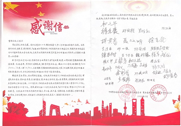 在辞别不平凡的2022年,迎接奋发进取的2023年之际,中国科学院西安分院 陕西省科学院的乡村振兴帮扶单位——紫阳县双安镇沔浴河村村支部委员会 紫阳县双安镇沔浴河村村民委员会和帮扶户的村民代表向分省院(分)党组书记 院长赵卫致以情真意切的感谢信,感谢赵卫带领分省院干部职工对沔浴河村脱贫攻坚和乡村振兴工作带着高度的责任感和使命感,极力发挥分省院科技创新优势和相关资源,积极主动作为,真心实意帮扶,为沔浴河村攻克深度贫困做出了积极贡献,以及为巩固脱贫成果与乡村振兴有效衔接的工作和将开展乡村振兴工作打下坚实了基础。