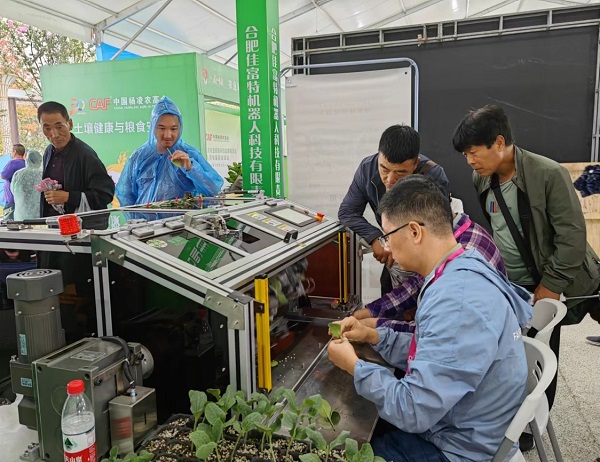 安徽省农业科技企业展示的果蔬智能嫁接机,可准确高效完成蔬菜育苗过程中嫁接作业。 张行勇 摄影