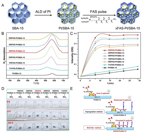 图1 催化剂的(A)制备流程图、(B)H2-TPD谱图、(C)H-D交换速率图、(D)与WO3混合样品的颜色随时间变化照片以及(E)典型的Pt/SBA-15、250FAS-Pt/SBA-15和1%FAS-Pt/SBA-15表面氢溢流示意图。