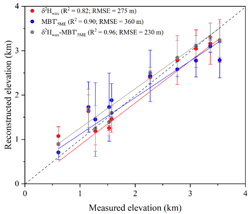 近期,科研人员通过对半干旱区秦岭主峰太白山沿不同海拔梯度进行多次表层土壤取样调查,发现叶蜡δ2Hwax值和brGDGTs派生的MBT'5ME随高度变化显著,其中δ2Hwax-MBT'5ME指标耦合可以有效提高与高度指示精度:R2 = 0.96 相比R2 = 0.82和0.90;RMSE = 230米相比RMSE = 275米和360米(图 1)。接着,研究人员将该方法应用于青藏高原进行验证,也发现δ2Hwax-MBT'5ME指标可以有效提高精度(图 2)。因此,δ2Hwax-MBT'5ME指标可以有效地作为干旱半干旱区古高度重建的指标。