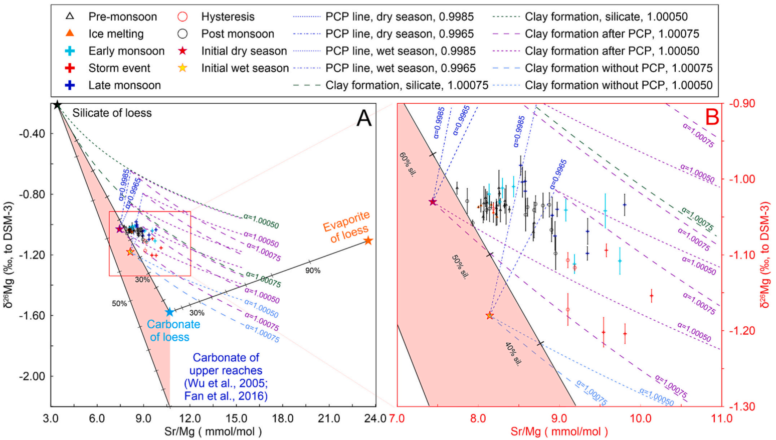 中国科学院地球环境研究所金章东研究团队,联合法国岩石地球化学研究中心、巴黎地球物理研究所、德国美茵茨大学等国际科学家,利用黄河中游季节性河水样品,分析了河水Mg和Sr同位素组成,发现引入五端元混合模型可以有效解释黄河中游Mg移除过程以及87Sr/86Sr季节变化。首先,他们搭建了方解石-白云石溶解框架,结合黄土淋滤实验数据,并根据优先碳酸盐岩移除过程的分配系数,刻画了碳酸盐岩溶解过程中不同矿物溶解-再沉淀过程对Sr/Ca和Mg/Ca的响应。随后,他们根据方程确定了干旱季节碳酸盐岩相对硅酸盐岩风化的贡献比例,再结合季风期下降的δ26Mg和87Sr/86Sr下降值,确定了季风期碳酸盐岩的贡献比例有所上升(约10%)。在确定了碳酸盐岩与硅酸盐岩贡献比例的基础上,他们再利用瑞利分馏模型,模拟了次生碳酸盐优先沉淀与粘土生成对镁同位素的分馏。模型结果表明,δ26Mg和87Sr/86Sr季节变化的初级控制要素是季风降雨导致的碳酸盐岩溶解,其次是次生碳酸盐优先沉淀过程,可向偏重方向分馏镁同位素约0.17‰至0.39‰;紧随着的是粘土的生成,将进一步降低河水镁同位素组成,最终造成我们在大陆尺度上所能观测到的河水镁同位素季节变化(如下图)。
