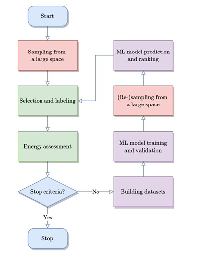 图1. 基于主动学习的辣搜(LAsou)方法进行材料结构预测的流程图