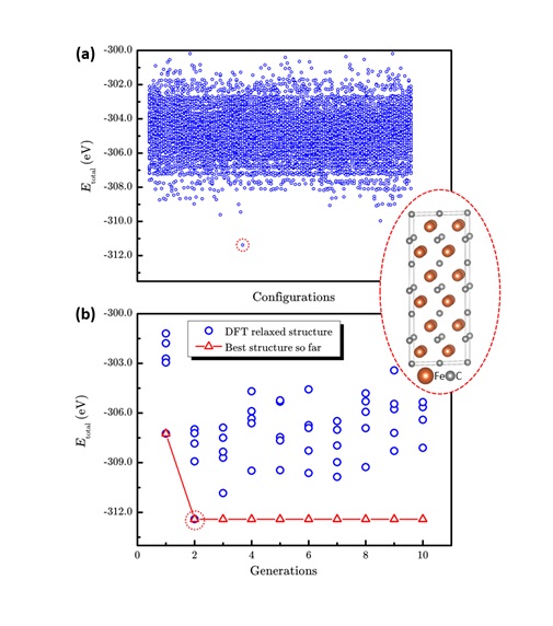 图4. 传统枚举法和辣搜(LAsou)法在ε-FeCx (x=0.5)体系预测的表现。(a)10496个枚举结构和最稳定结构的总能量散点图。(b)辣搜(LAsou)方法搜索过程中总能量随搜索代数的演化。