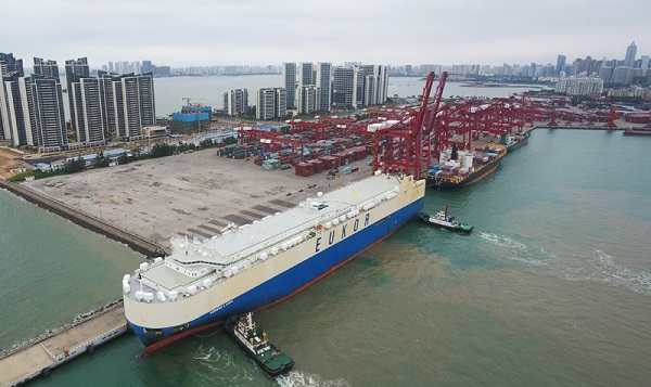 滚装货船“劳拉”轮驶入海口秀英港,这是海南自贸区政策实施以来的首艘汽车外贸船(2月16日摄,无人机照片)。新华社记者 杨冠宇 摄