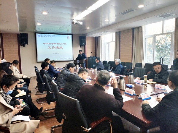 西安分院分党组副书记詹瑞、纪检组组长康贸易和副院长陈怡平,国家授时中心党委书记窦忠,西安光机所副所长胡炳樑,地球环境所基建后勤处处长武振坤,陕西省动物所所长常罡、生物农业所书记徐升运,陕西省微生物所副所长李峻志、西安植物园副主任刘立成及西安科学城公司战略发展部部长贾娜和机关各部门负责人参加会议。
