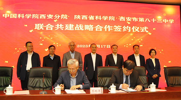 随后,分省两院与西安市八十三中举行了联合共建战略合作签约仪式和科教融合示范基地揭牌仪式。赵卫与刘忠建签署了联合共建战略合作协议。张涛、张涌、赵卫、李红雨共同为科教融合示范基地揭牌。