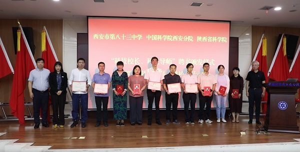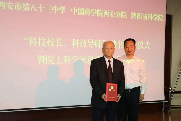 仪式现场,西安市第八十三中学校长刘忠建致欢迎词,与会领导向中国科学院院士侯洵颁发科技校长聘书,向中国科学院西安分院、陕西省科学院十名科技导师颁发聘书,并为“侯洵科学探究实验室”揭牌。