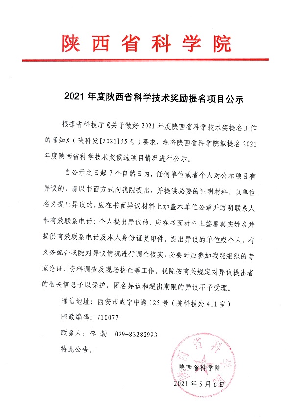 根据省科技厅《关于做好2021年度陕西省科学技术奖提名工作的通知》(陕科发[2021]55号)要求,现将陕西省科学院拟提名2021年度陕西省科学技术奖候选项目情况进行公示。