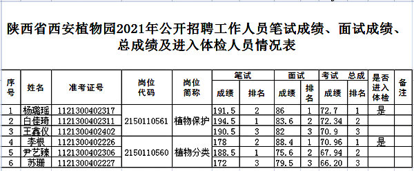 附件:陕西省西安植物园2021年公开招聘工作人员笔试成绩、面试成绩、总成绩及进入体检人员情况表