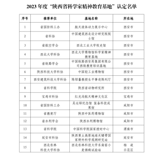 同日,省科协、省教育厅、省科技厅、省国资委、省国防科工办、省科学院正式公布了2023年度“陕西省科学家精神教育基地”认定名单,航天液体动力展示中心、中国建筑西北设计研究院院士馆、西北工业大学校史馆等15个基地入选。
