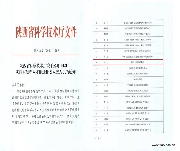 近日,陕西省科技厅公布2021年度“陕西省创新人才推进计划人选人员”的通知,我园陈尘博士入选2021年度“陕西省青年科技新星”。