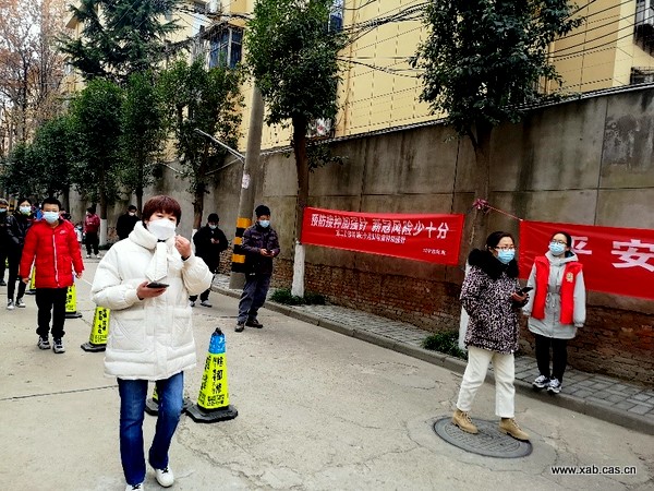 1月4日早晨,接到九点开始核酸检测的通知后,及早赶到以提前对开展核酸检测的区域进行消毒。当医护人员来时,协助他们准备工作,在采样试管上粘贴二维码标签等。在进行核酸检测时,为打不开一码通的人员,以及身份信息过期的老人、小孩,重新录入身份信息,以便核酸检测工作能更有效地开展。