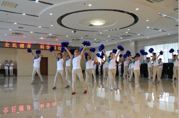 本次活动共分为两个环节:第九套广播体操展示及啦啦操表演。随着刘禹所长一声号令“全民健身日”展示活动正式启动,第九套广播体操那熟悉的音乐响起,地环所队员们昂首挺胸,伸展,扩胸、转体、踢腿……动作娴熟,张弛有度,充盈着刚健之美。在两轮广播体操展示结束后,所工会精心为大家聘请的西安体育学院的专业教练指导的啦啦操汇报演出,从基本动作、动作设计到表演曲目都是那么浑然天成,集体操、舞蹈、音乐、健身、娱乐于一体,更集团队协作、奋发向上、自信热情于一身,全面展现出了地环所人朴实的科研情愫下那张扬热烈、朝气蓬勃的精神力量。