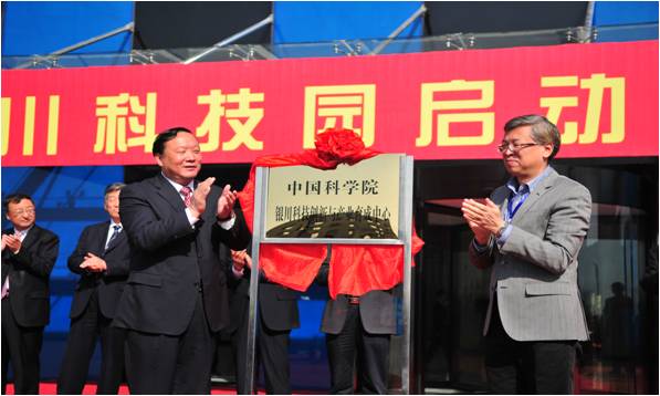 中共宁夏回族自治区党委常委、银川市委书记徐广国和中国科学院西安分院院长赵卫共同为中科院银川中心揭牌