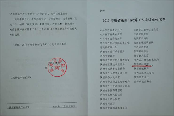 据近日陕西省财政厅(陕财办库(2014)39号)“陕西省财政厅关于表彰2013年度部门决算工作先进单位的通报”文件,根据《陕西省部门决算考核评比办法》,结合2013年省级各部门决算编审工作情况,评选出省委办公厅、陕西省科学院等单位为决算先进工作单位,予以通报表彰。