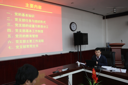随后,党委办公室主任曹玉玻从党支部的设置与职责分工、党支部基本工作制度、党员的教育管理、支部工作主要流程等方面作了培训学习,并就新颁布的《中国共产党发展党员工作细则》,结合中心实际,对发展党员的全过程进行了详细解读。