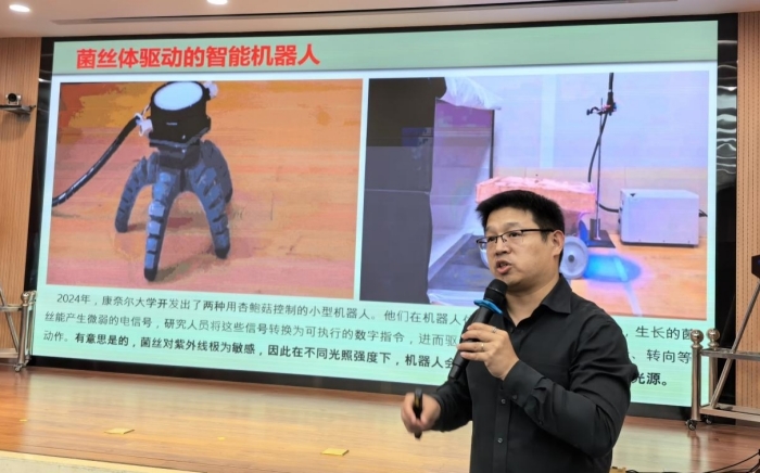 陕西省生物农业研究所副所长、资深科普工作者李勃带来的《蘑菇除了涮火锅,还能用来干点啥》专题科普讲座,是本次活动的“重头戏”。讲座中,李勃凭借深厚的专业功底与生动风趣的表达,从独特视角解读生物世界的奥秘,“菌丝体驱动的智能机器人”“未来空间站的人造肉美食”“未来火星可以用蘑菇盖房子”等新奇科研案例,让现场观众连连惊叹“脑洞大开”,深刻感受到生物科技的无限可能。