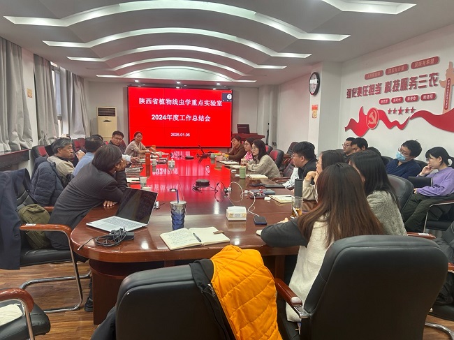 1月5日, 陕西省植物线虫学重点实验室组织召开2024年度工作总结会。重点实验室主任、植物线虫专业委员会主任、中国农业科学院植物保护研究所研究员彭德良,实验室副主任冯俊涛教授,实验室共建单位西安金鹏种苗有限公司总经理李晓东,实验室学术委员会副主任陈志杰研究员,陕西省生物农业研究所副所长张锋研究员,实验室常务副主任李英梅研究员等以及开放课题项目负责人、技术团队带头人及骨干20余人参加会议。会议由李英梅主持。