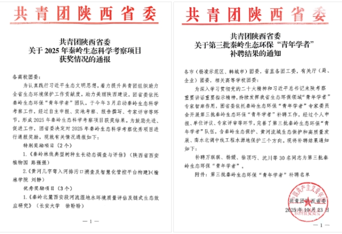 近日,共青团陕西省委通报了2025年秦岭生态科学考察项目的评审获奖情况,陕西省西安植物园路强强博士申报完成的“秦岭林线典型树种生长动态调查与评估”获特别奖励。秦岭生态科学考察项目是为认真践行习近平生态文明思想和历次来陕考察重要讲话重要指示精神,着力提升共青团组织助力美丽陕西建设而设立,团省委依托秦岭生态环保“青年学者”团队,经自主申报、实地考察、报告撰写、现场答辩、专家评审等环节,形成优秀项目获奖结果。