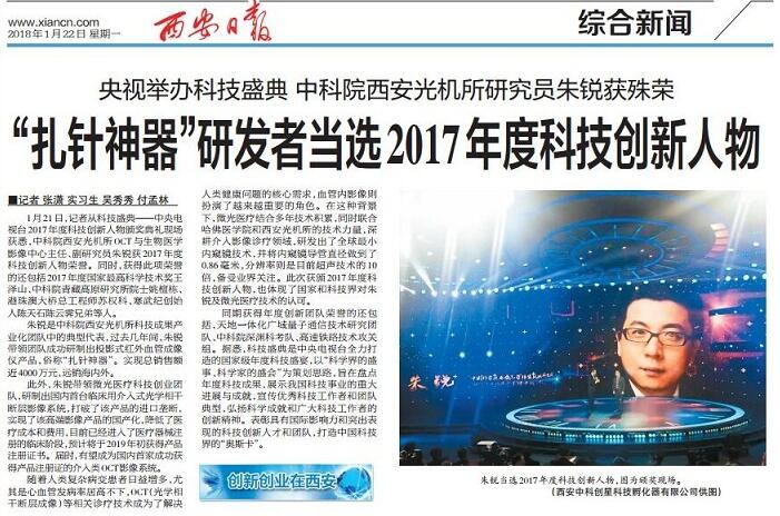 1月21日,记者从科技盛典——中央电视台2017年度科技创新人物颁奖典礼现场获悉,中科院西安光机所OCT与生物医学影像中心主任、副研究员朱锐获2017年度科技创新人物荣誉。同时,获得此项荣誉的还包括2017年度国家最高科学技术奖王泽山、中科院青藏高原研究所院士姚檀栋、港珠澳大桥总工程师苏权科、寒武纪创始人陈天石陈云霁兄弟等人。