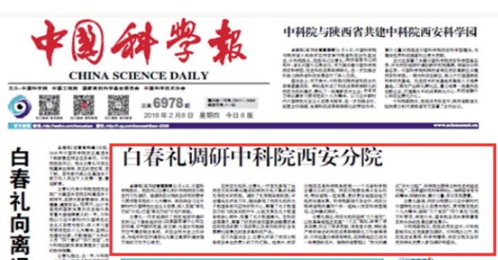 白春礼一行实地调研了西安地球环境研究所(以下简称地环所)加速器质谱中心和生态环境、古气候研究室、岩芯库、大型太阳能城市空气清洁综合系统,并在全所大会上作讲话,对地环所在环境变化与黄土高原环境治理方面的工作予以肯定。