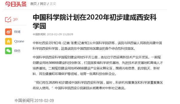 中新社西安2月9日电 (记者 张素) 记者9日从中国科学院获悉,该院与陕西省人民政府共建中国科学院西安科学园,这是该院在中国西部地区建设的首个综合性科技园区。