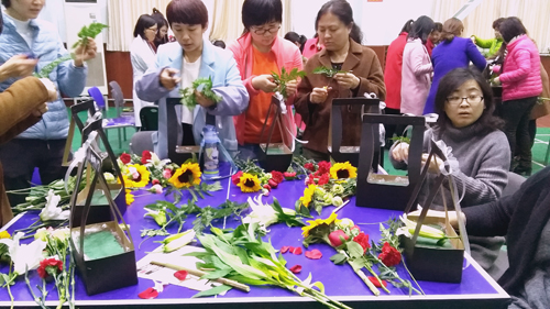 39日,为庆祝 “三八”国际妇女节,促进女职工身心健康发展,国家授时中心女职工委员会组织了一场花艺培训活动,60名女职工参加。