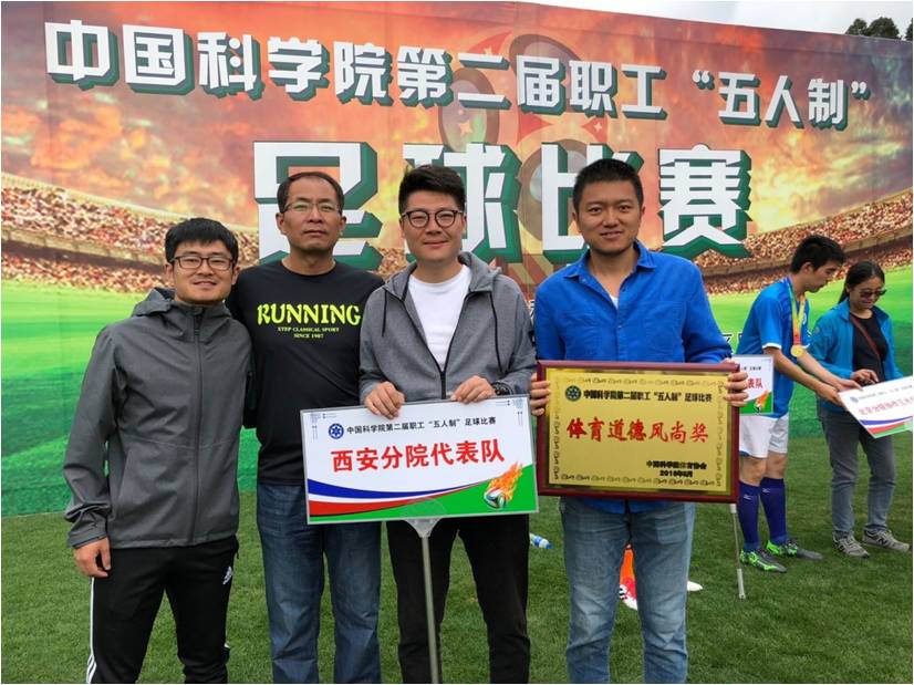 为贯彻落实《全民健身条例》和《全民健身计划(2016-2020年)》,扎实推动科研单位群众体育工作的广泛开展,中科院第二届职工“五人制”足球赛于5月18日至23日在昆明举办。由地环所董吉宝、范煜坤、王启元、张宁宁,光机所郭琨、张昊苏,授时中心陈江以及分省院机关张威组成的西安分院足球队克服困难,以高度的责任感和集体荣誉感顽强拼搏,最终以3胜3负的成绩坚持到了最后,位列第十名,并荣获体育道德风尚奖。