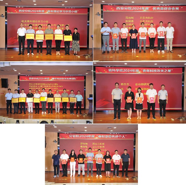 与会领导为分省院2024年度“青年理论学习示范小组”“青年科技攻关先锋团队及个人”“奉献基层先进个人”“优秀青促会会员”等29个获奖代表颁奖。5名获奖代表分别围绕国家、研究所和个人成长发展,讲述了如何带领科研团队协作共克时艰,携手完成各项专项任务,如何面向国家重大需求集智攻关加快科技成果应用、如何扎根地方开展特色资源挖掘应用、一年300余天深入乡村服务基层的故事,诠释了新一代青年的职责与使命,也体现了青年党员的奋进正当时、青年勇担当的决心。