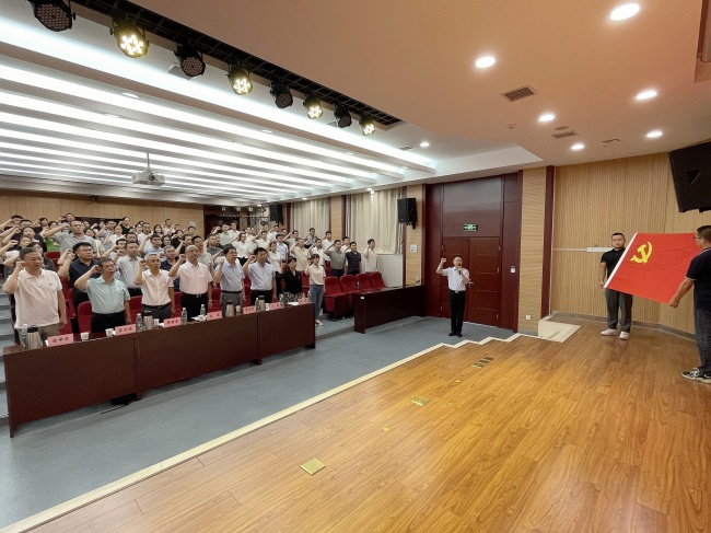 听完老一辈科学家精神和新时代科技骨干的心声,新发展党员面向鲜红的党旗庄重宣誓,全体参会人员共同起立,铿锵有力、掷地有声的重温入党誓词,进一步坚定理想信念、牢记初心使命。