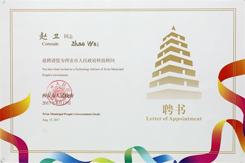 19日晚的首届世界西商大会科技顾问、经济顾问授聘仪式,西安市人大常委会主任胡润泽、市政协主席岳华峰出席,市长上官吉庆致辞并为各位顾问颁发聘书。赵卫院长被颁西安市人民政府科技顾问证书,同时获聘的还有西安交通大学校长王树国,西北工业大学校长汪劲松,中国科学院院士、西安电子科技大学党委书记、校长郑晓静,西北大学校长郭立宏,长安大学校长陈峰,陕西师范大学校长程光旭,西北有色金属研究院院长张平祥,爱国者集团董事长冯军8位专家学者。