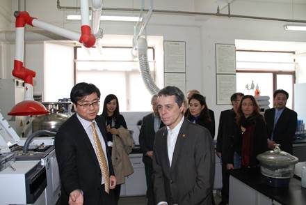 在参观过程中,Cassis先生对地球环境所在环境与气候方面的高水平研究表现出浓厚兴趣,与科研人员充分交流最新进展,同时他还不时询问地球环境所与瑞士科研机构的合作研究,重点了解瑞士发展合作署资助的地球环境所与瑞士PSI(保罗谢勒研究所)即将开展的气溶胶与空气污染方面的合作项目。