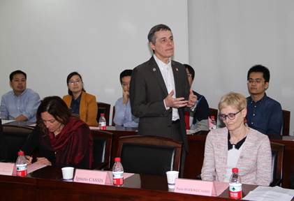 座谈会议上,青年科研人员和学生踊跃提问。Cassis先生针对大家提到的空气污染、环境健康、科学研究、国际合作、经济发展等问题,进行了认真回答,同时他强调了中瑞科技合作的重要性和光明前景。最后,Cassis先生表达了对地球环境所的感谢和美好祝愿“Thanks a lot for your explications and all the best for a successful future!”,并表示非常满意此次在地球环境研究所的访问安排。