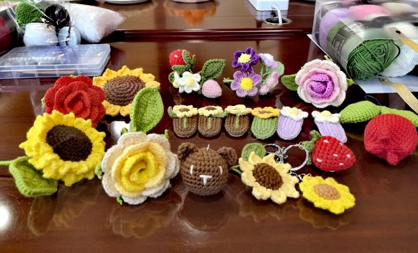 手工制作活动特别邀请省生物农业研究所工会委员闫春娟等三位老师,她们向大家介绍钩花的基础工具和材料,耐心细致地讲解钩织花朵的配色、针法和技巧,教大家如何用一根钩针一捆毛线,编织出灿烂又明媚的向日葵。
